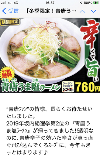 「坂内」から、「青唐うま塩ラーメンを冬季限定でやっていますよ」というメールが来ました。